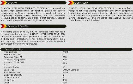 SUNOCO ULTRA HIGH TEMP RED GREASE 2是一種優質、高溫度、EP強化設備潤滑脂。一種鋰基復合堿與一種專有的聚合物,選擇添加劑,和非常粘稠的基礎油,以制定一種油脂,提供卓越的負載處理能力在非常高的溫度。