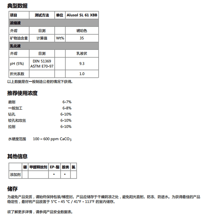 低泡。(在建議的水硬度條件下) 特別設計的潤滑組合有助于延長刀具壽命,改善鋁加工時的表面光潔度。 出色的潤濕性有助于減少切削液的帶走量,并保持機床和工件的整潔。 不含硼,符合特別注明不含硼的廢棄物處理相關規定的要求。 不含氯、不含甲醛釋放劑、不含亞硝酸鹽,符合當地法律法規的要求以及廢棄物處理的有關規定。